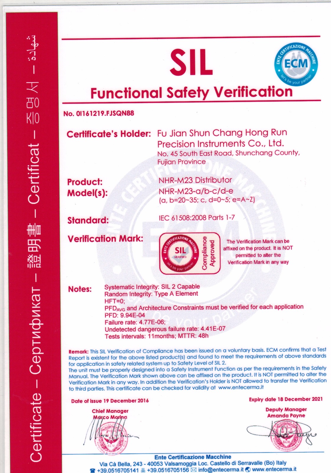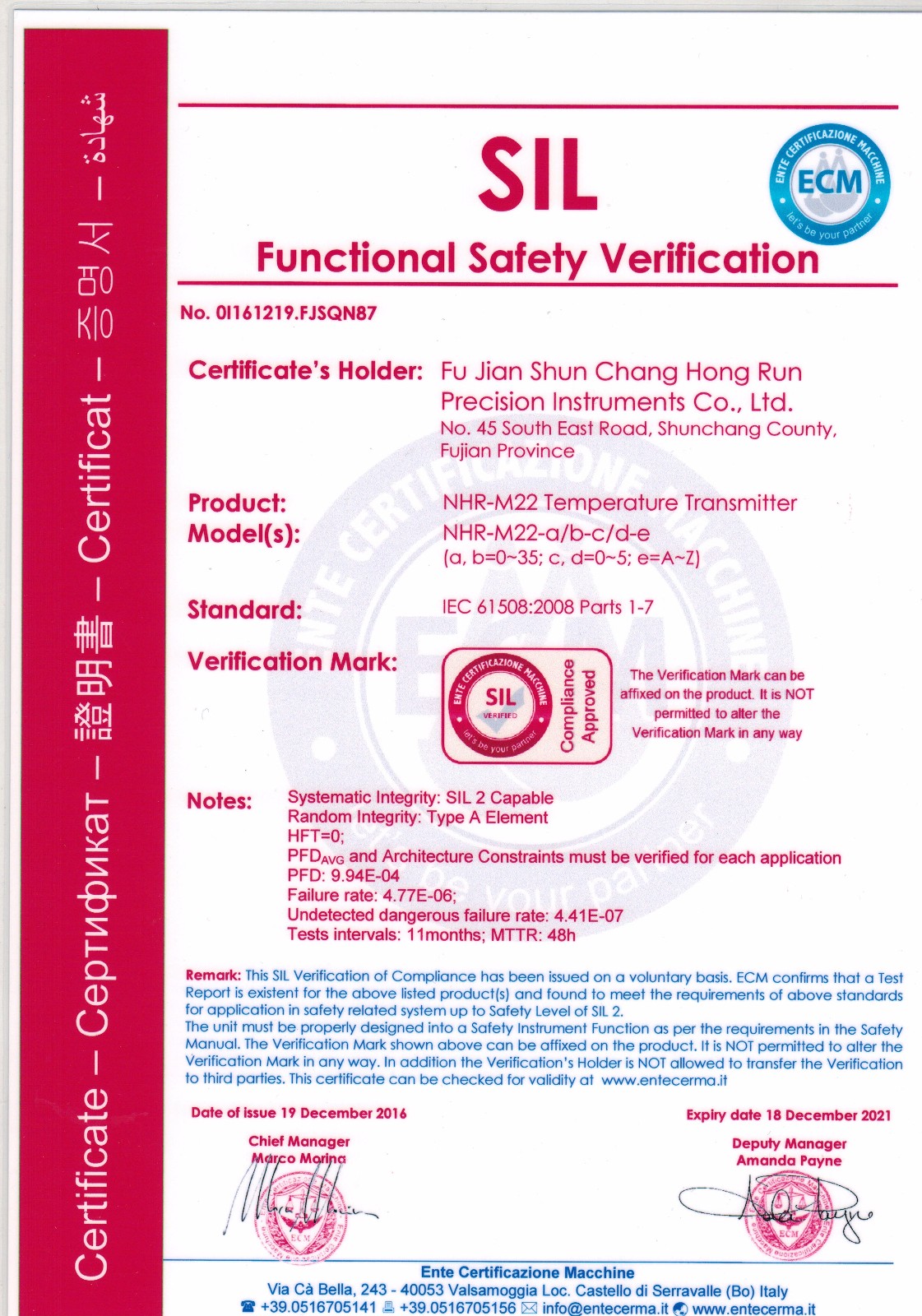 近日,虹潤智能儀表系列產品再傳喜訊,虹潤兩款智能儀表產品NHR-M22溫度變送器、NHR-M23配電器獲得了國際SIL2功能安全認證證書。這標志著虹潤儀表產品的安全性達到了國際標準。也為虹潤產品實現走向世界的美好愿景再一次打下了堅實的硬件基礎。