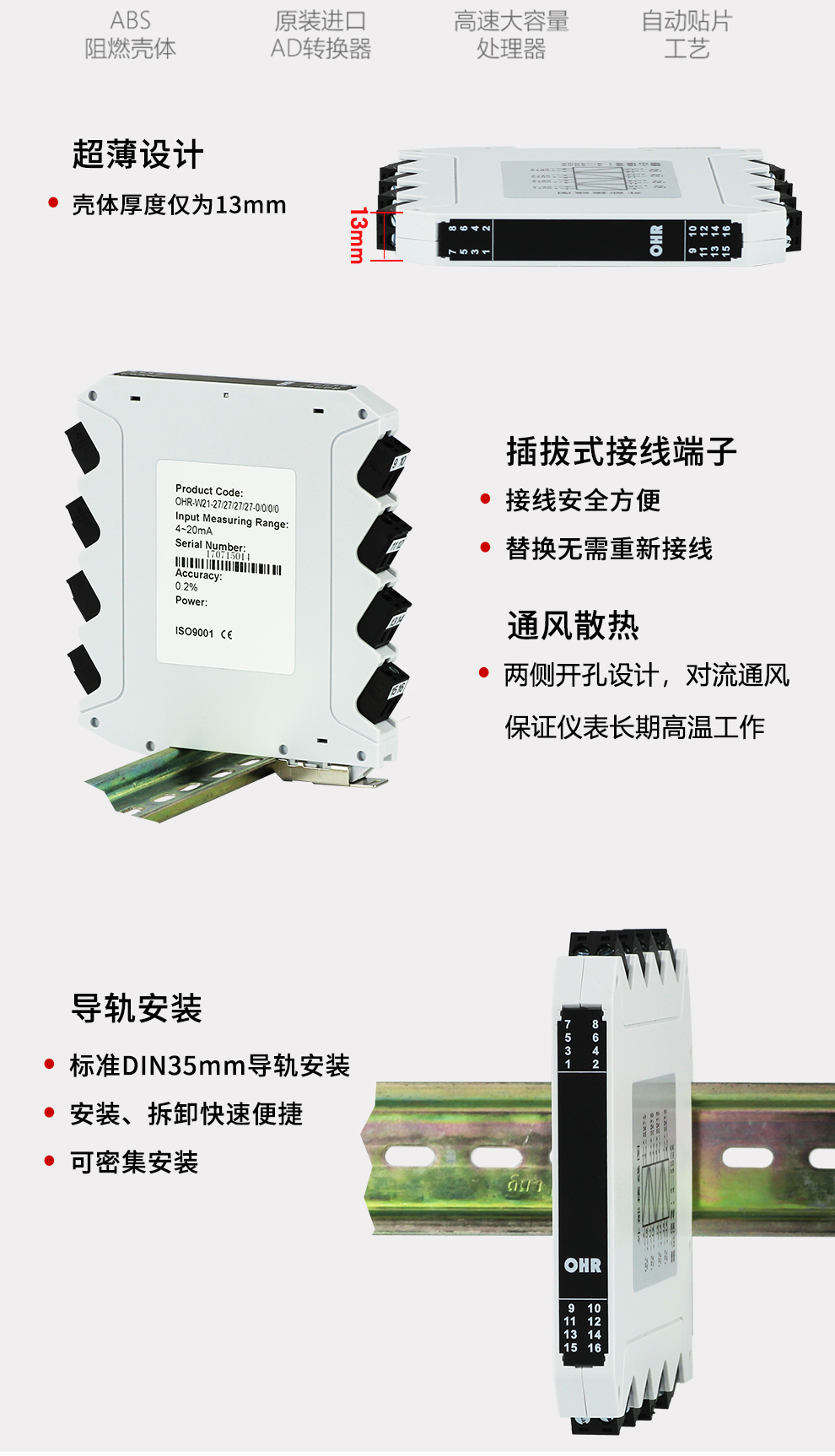 OHR-W21系列無源信號隔離器無源信號隔離器無需外供電源,由輸入回路供電,實現(xiàn)信號隔離??梢耘c各種工業(yè)傳感器、現(xiàn)場儀表配合,取回參數(shù)信號,隔離變送傳輸,滿足用戶本地監(jiān)視遠程數(shù)據(jù)的需求。本產品品種分為一進一出、兩進兩出、三進三出、四進四出,且輸入、輸出磁隔離。