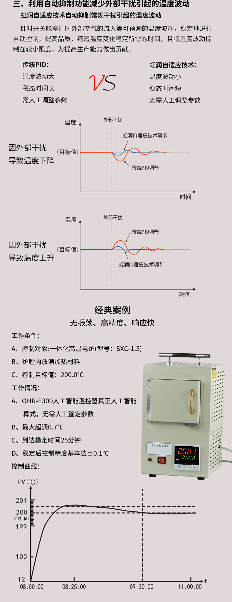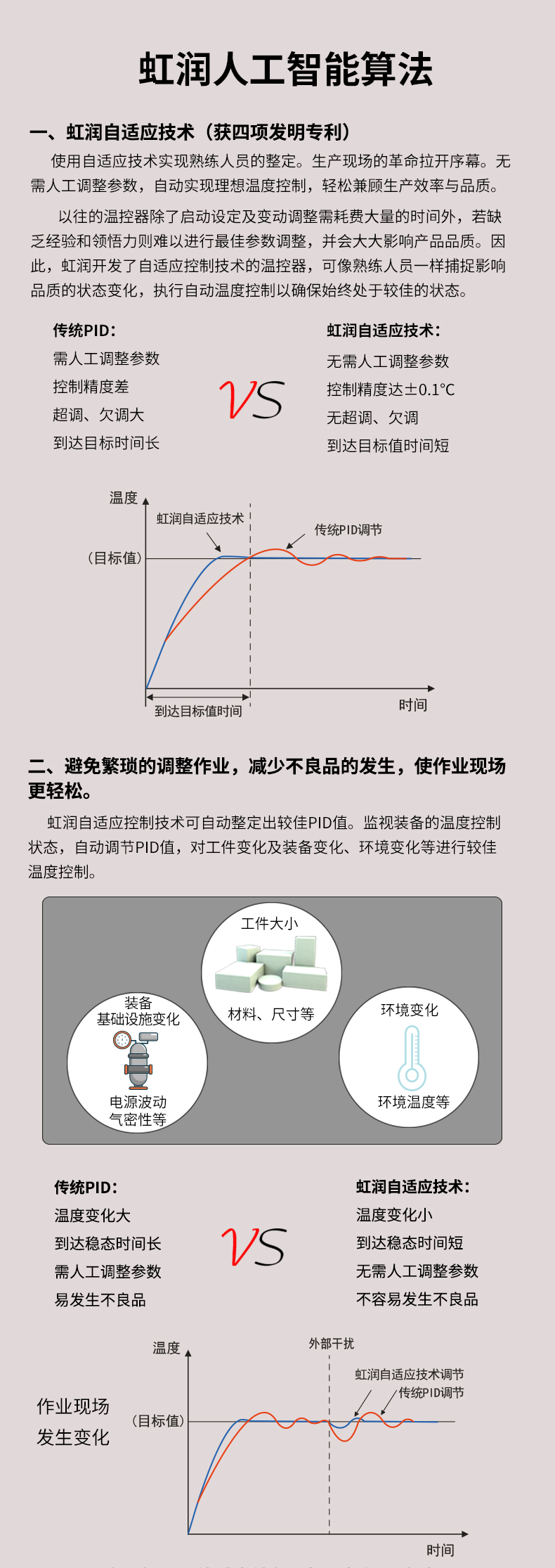 虹潤公司是專業(yè)生產溫控器的國家專精特新“小巨人”企業(yè)。生產的人工智能溫控器,具有真正人工智能算式,無需人工整定參數(shù),控制精度可達±0.1°C,多種輸出類型,高抗干擾等特點。產品獲得模糊PID控制儀及控制方法、人工智能調節(jié)器、智能化控制器、移相觸發(fā)控制器、閥門自動手動無擾動操作控制方法及裝置等5項國家發(fā)明專利,主持起草工業(yè)過程控制系統(tǒng)用模擬輸入兩位或多位輸出儀表、物聯(lián)網智能溫度儀表通用技術條件、工業(yè)過程測量和控制系統(tǒng)用智能調節(jié)器等3項國家標準,以及通信系統(tǒng)多通道數(shù)據(jù)采集控制終端規(guī)范軍用標準,參與國際5G標準制定,取得模糊PID溫控儀等3項相關軟件著作權。產品廣泛應用于電力、石化,冶金、制藥、食品等幾乎所有工業(yè)現(xiàn)場,實現(xiàn)精準控溫,保障生產安全與質量。