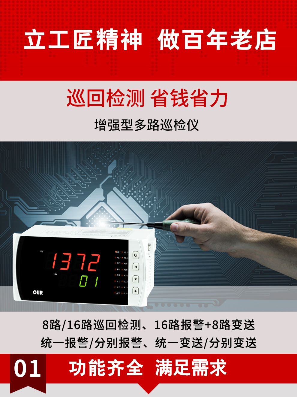 虹潤公司是專業生產多路溫度巡檢儀的國家專精特新“小巨人”企業,生產的增強型多路巡檢儀,具有8路/16路測量通道,全切換信號輸入,多種輸出類型,高抗干擾,RS485/RS232通訊等特點。產品獲得巡回檢測顯示方法及裝置、儀表殼體等2項國家發明專利,主持起草工業過程控制系統用模擬輸入兩位或多位輸出儀表、物聯網智能溫度儀表通用技術條件等2項國家標準,以及通信系統多通道數據采集控制終端規范軍用標準,參與國際5G標準制定,取得多回路測量顯示控制儀等3項相關軟件著作權。產品廣泛應用于電力、石化、冶金、制藥、水處理、機械配套等各種工業現場。