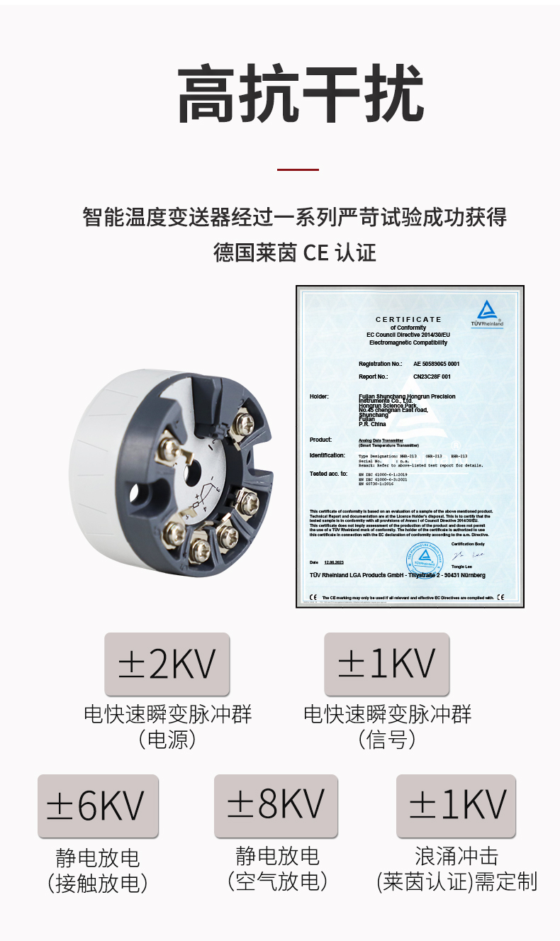 虹潤公司是專業生產溫度變送器的國家專精特新“小巨人”企業。生產的智能溫度變送器,具有適配各類溫度傳感器,精度高,穩定性好,通過編程線修改輸入信號類型及量程,高抗干擾等特點。該產品不僅通過HART基金會認證、德國萊茵 CE 認證與 SIL 功能安全認證,還獲得具備減震抗干擾能力的溫度變送器、信號隔離器、一種二端子模塊、無源信號隔離器等4項國家發明專利,主持起草物聯網智能溫度儀表、現場設備工具(FDT)接口規范、工業過程測量和控制系統用溫度變送器等3項國家標準,以及通信系統多通道數據采集控制終端規范軍用標準,參與國際5G標準制定,取得智能溫度變送器、HART溫度變送器等3項相關軟件著作權。產品廣泛應用于石油、化工、電力、冶金、制藥、食品、水處理等各種工業領域。